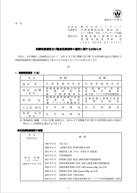 取締役候補者及び監査役候補者の選定に関するお知らせ
